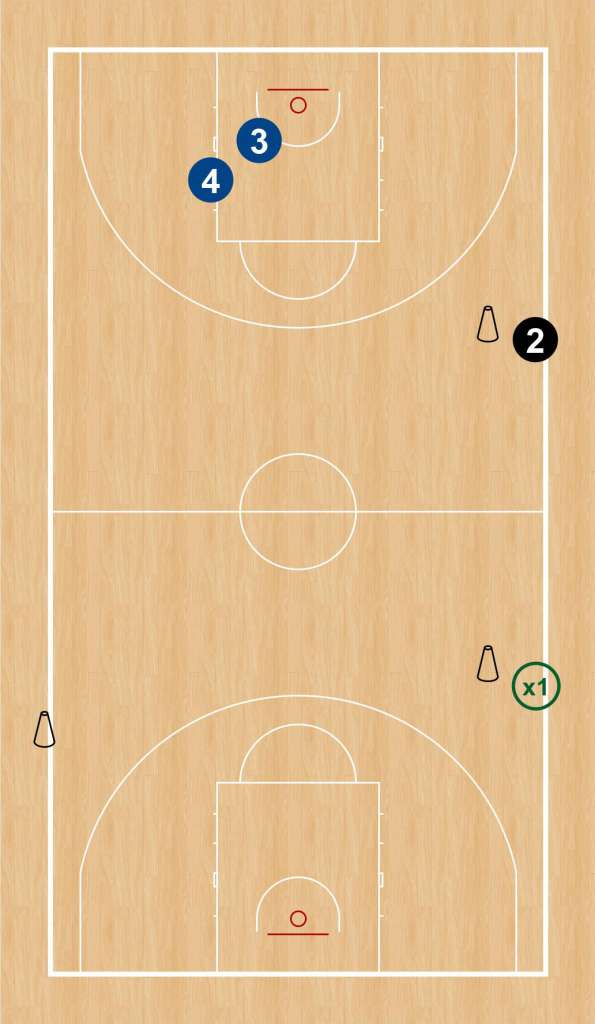 - Si el tirador anota su lanzamiento, el jugador que captura el rebote también debe rodear un cono (permitiendo al defensor una recuperación más agresiva).