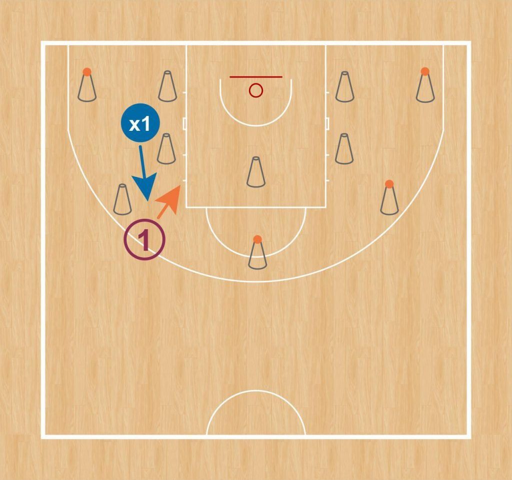 A la señal del entrenador (velocidad de reacción ante un estímulo auditivo), el atacante y el defensor corren para rodear el cono contrario (gráfico 1). El atacante recoge el balón y realiza su correspondiente lanzamiento exterior mientras el defensor recupera y trata de evitarlo (gráfico 2).
