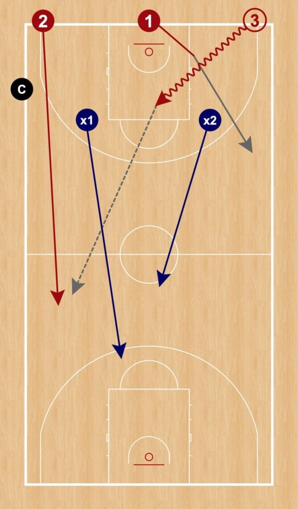 Cuando finaliza el 3c2, el último de los atacantes que ha tocado el balón baja a defender hacia la canasta de partida, enfrentándose a los dos defensores del 3c2.