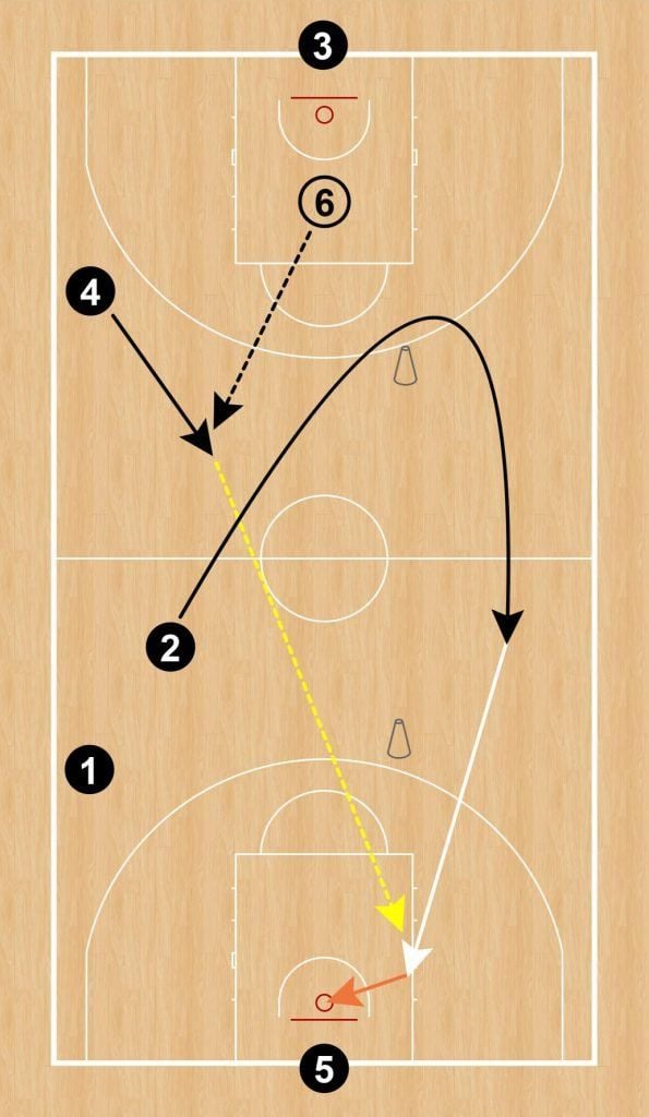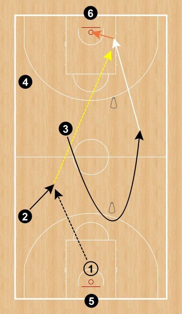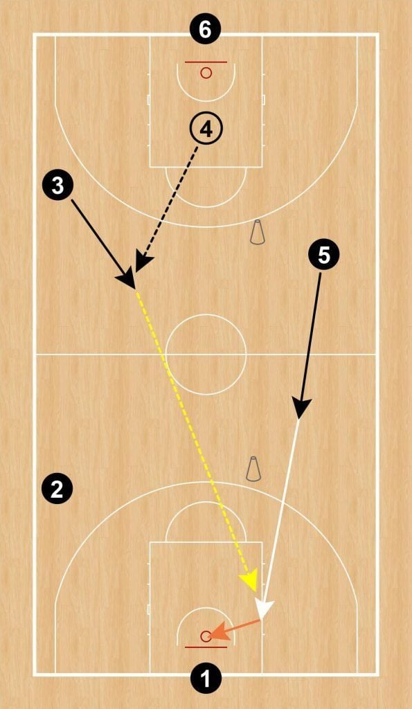 El balón empieza en las manos de uno de los jugadores que están debajo de la canasta. El compañero situado en la prolongación de la línea de tres puntos en esa media cancha se desplaza en carrera para recibir el primer pase y, sin botar, entregar el balón al compañero que corresponda para que éste finalice con una entrada a canasta.