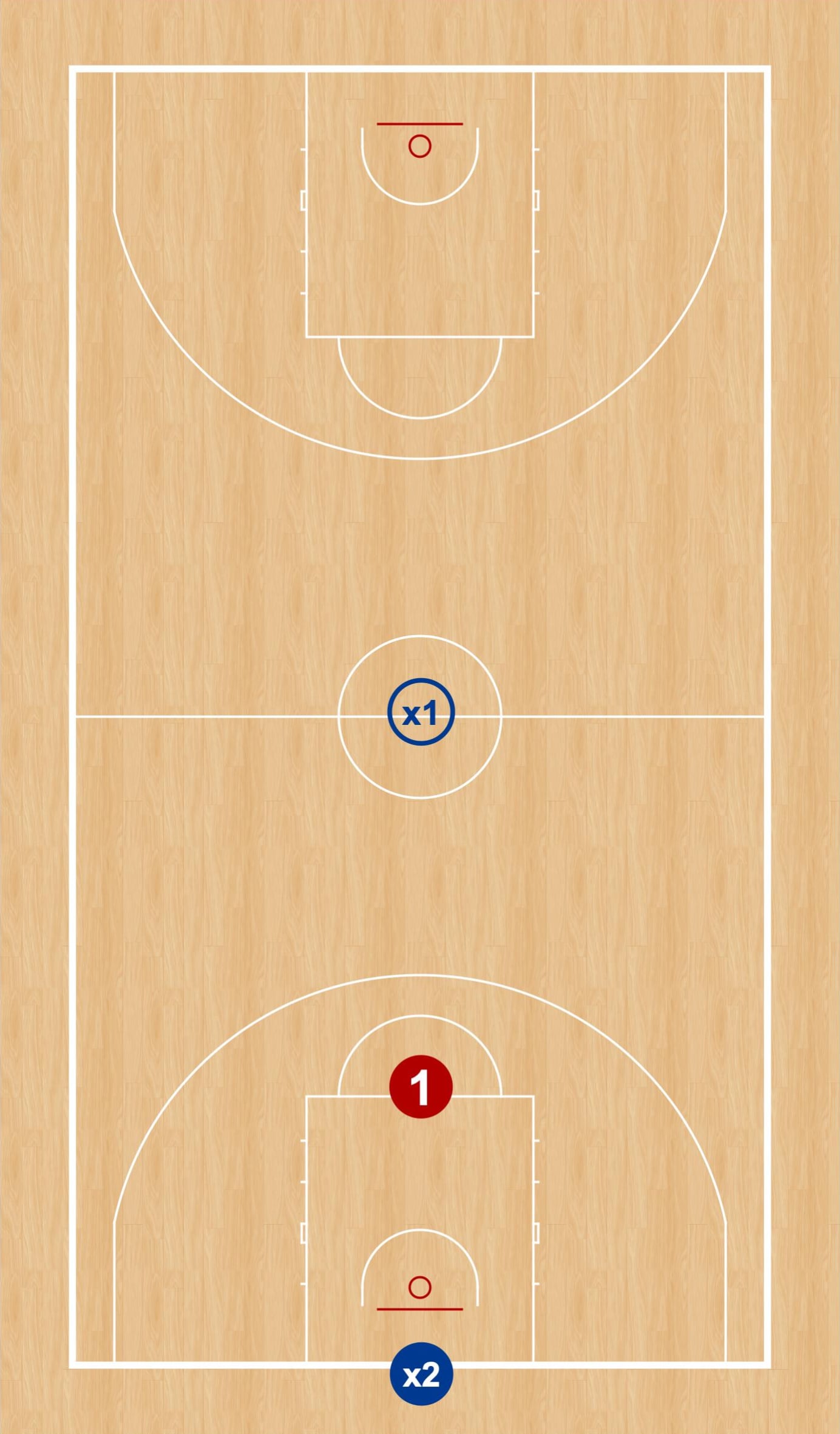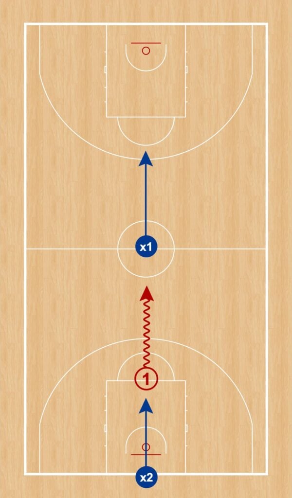🔄 Cuando termina el 1c2 (canasta anotada, pérdida del jugador atacante, robo directo, rebote defensivo o final de posesión), los equipos intercambian roles y se juega el 2c1 hacia la otra canasta.