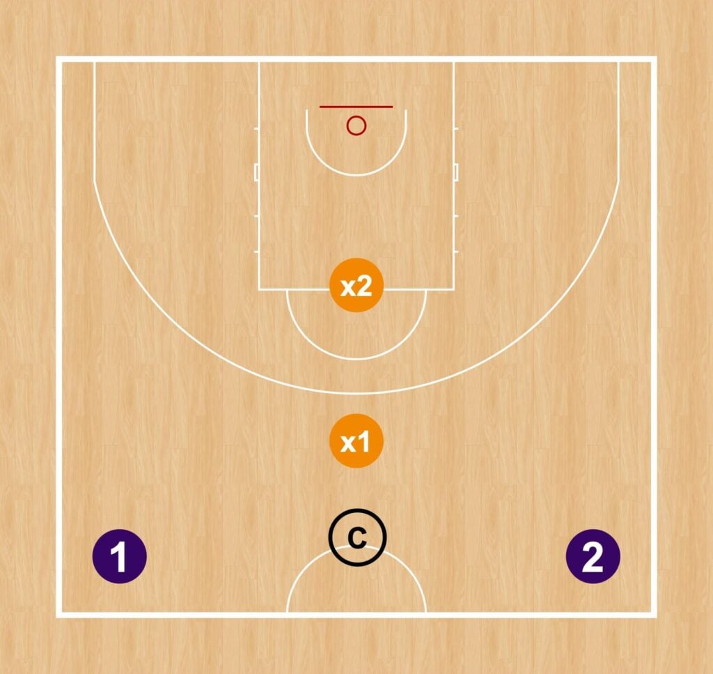 Este ejercicio de 2c2, creado por el entrenador lituano Arvydas Gronskis, se centra en los momentos finales de la transición, cuando los defensores deben establecer marcajes y presionar el balón para intentar neutralizar la ventaja del equipo atacante.