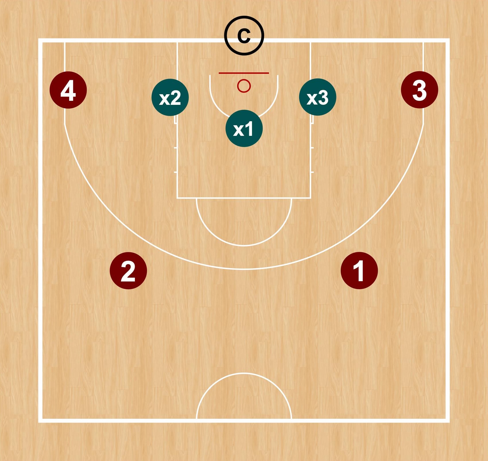 Aquí, Cooley configura una superioridad numérica ofensiva que demanda un esfuerzo extra en el trabajo del closeout, la comunicación defensiva, las rotaciones, la línea de pase, la ocupación de los espacios (triángulo defensivo) y presionar el balón.