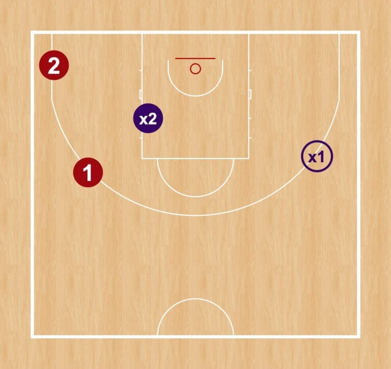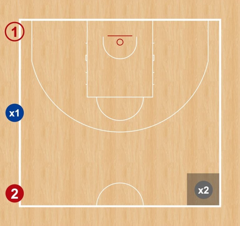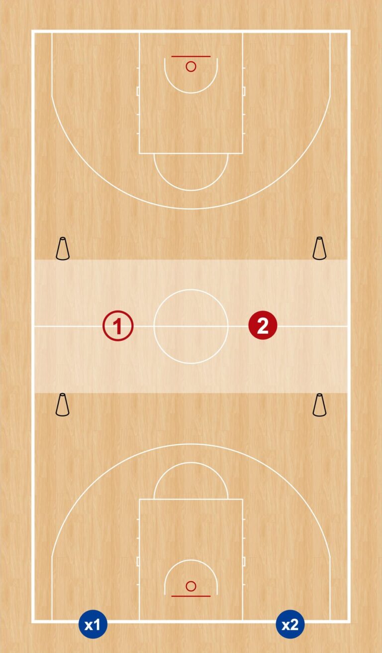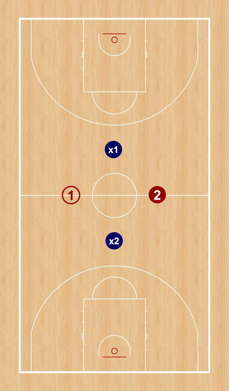 Con este ejercicio de Claudio Brambilla, podemos generar diversas situaciones de 2c2 a partir del pase inicial del entrenador. Si el receptor de ese pase está en la línea de fondo, el 2c2 se juega hacia la canasta contraria. Por el contrario, si el pase es a un jugador cerca del medio campo, el 2c2 se juega directamente en esa misma media cancha.