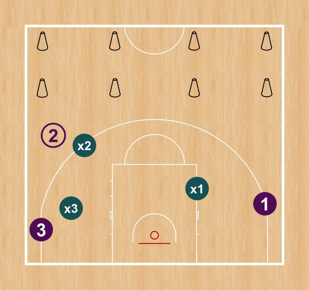 Tal y como podemos observar en nuestros dos últimos gráficos, para conseguir esa ventaja el atacante con balón debe rodear uno de los conos próximos a la línea de tres puntos. Su defensor, entonces, rodeará el cono más alejado.