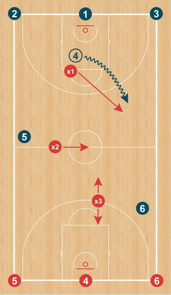 En esta situación de 3×3 constante se pueden acoplar infinitos aspectos: trabajar un determinado concepto ofensivo (pick ‘n’ roll, pase y bloqueo indirecto al lado contrario, juego sin bote…), aplicar normas en defensa (presionar saltando al trap prohibiendo el pase entre atacantes hasta cruzar el medio campo, apretar líneas impidiendo jugar puerta atrás…) y, en definitiva, cualquier cosa que se nos ocurra.