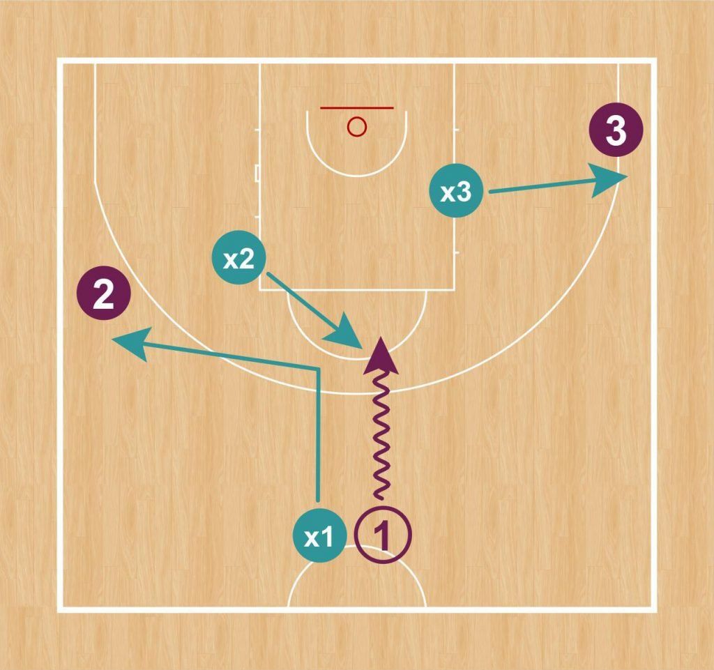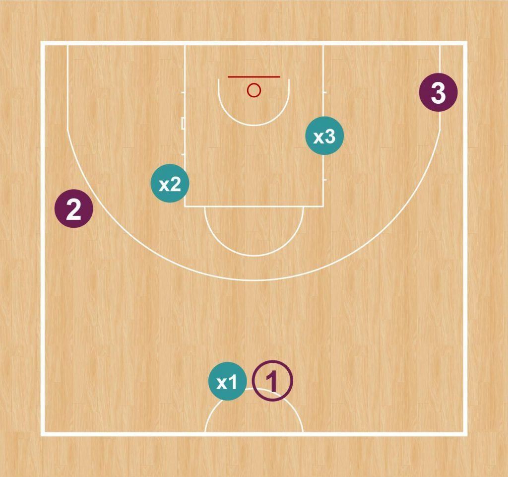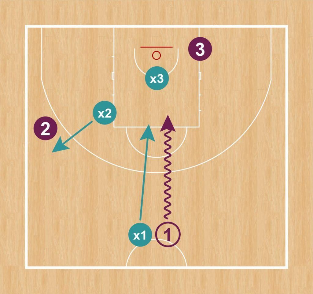 - El atacante con balón penetra desde una esquina o desde la posición de alero en 45º (útil para trabajar situaciones de extra pass).