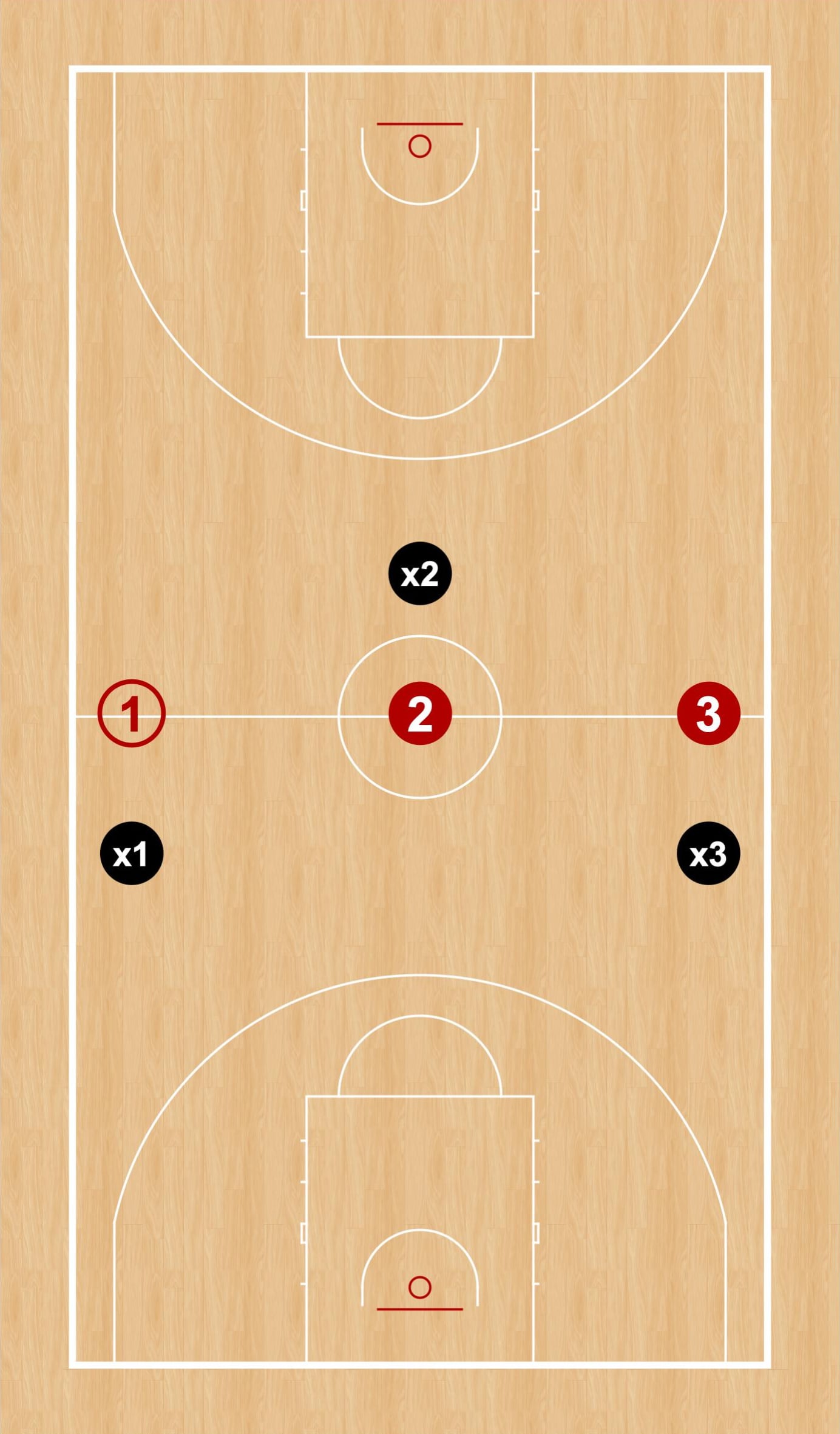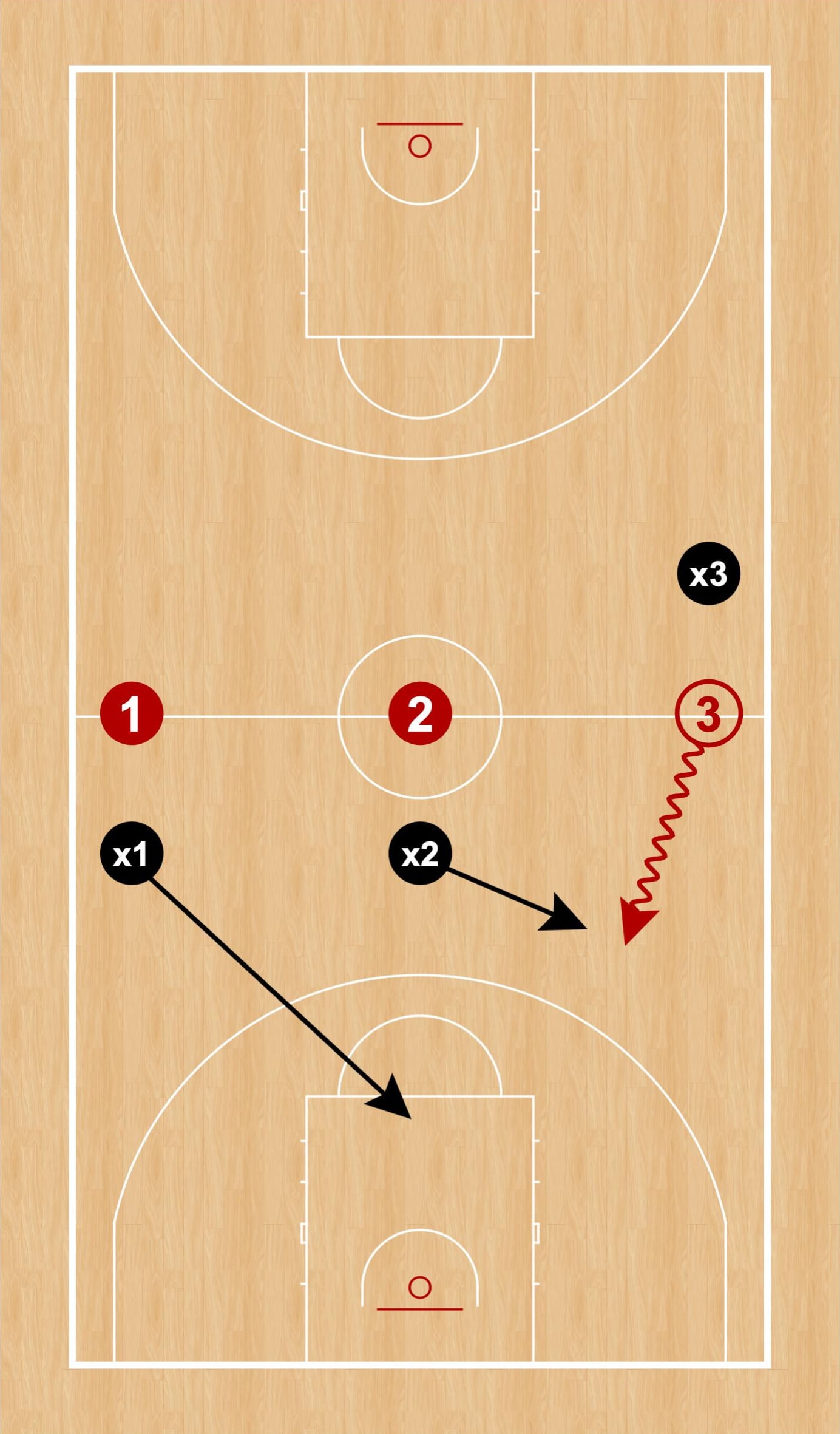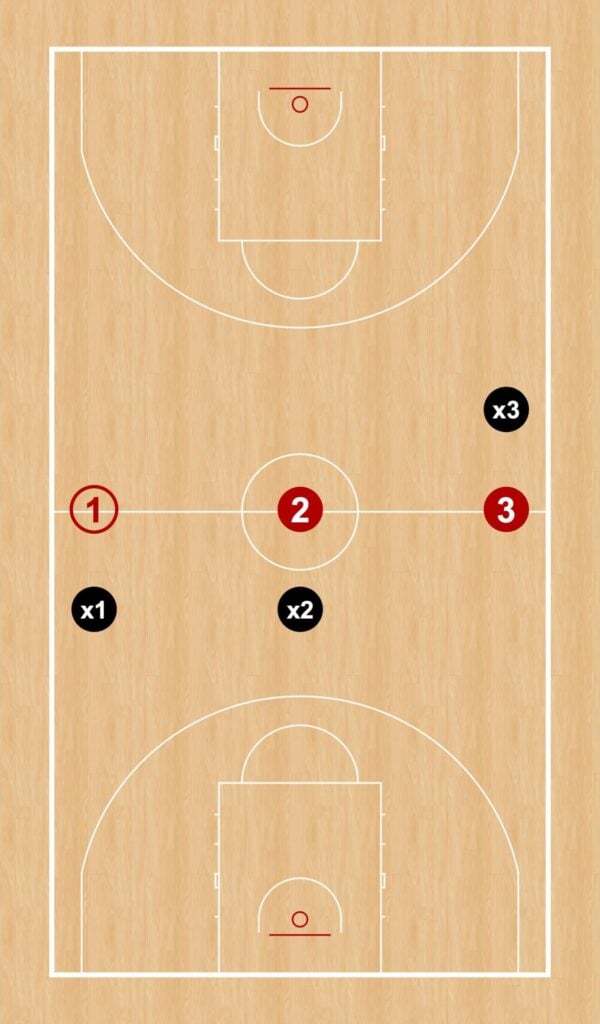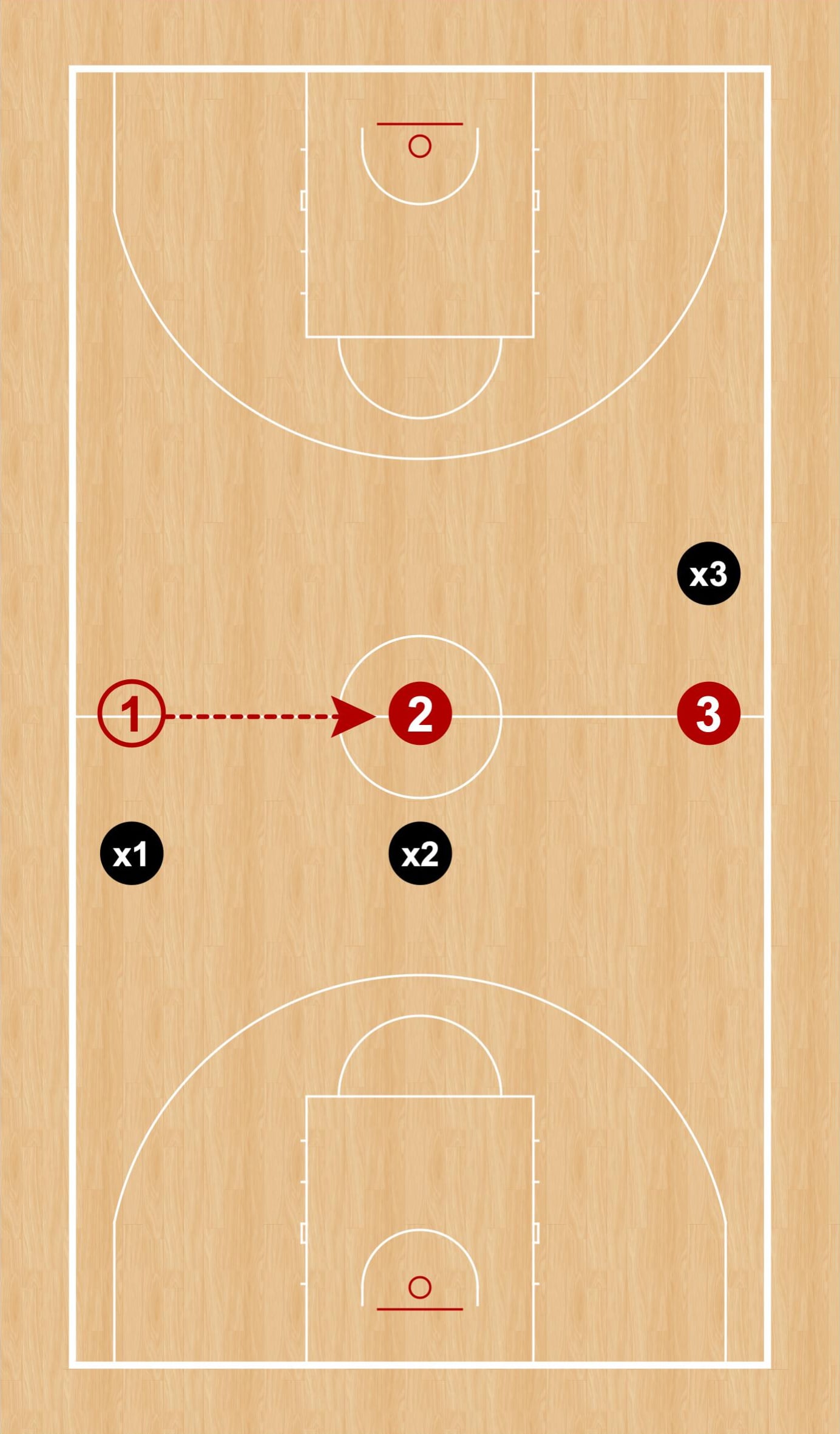 🤔 El atacante que recibe el primer pase tiene dos opciones: botar para atacar el aro o entregar el balón al tercer jugador.