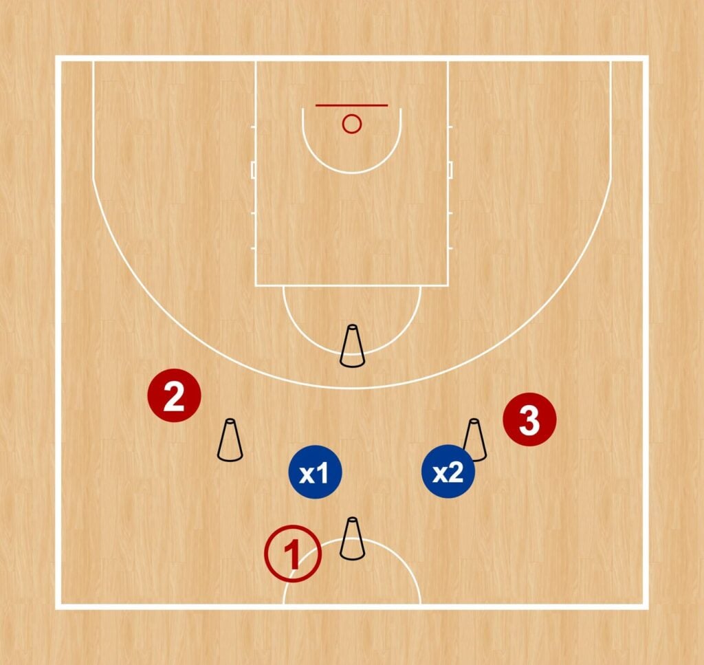 🚀 Con dos defensores, a la señal del entrenador se juega una superioridad numérica ofensiva real (en el mismo aro o hacia la canasta contraria).