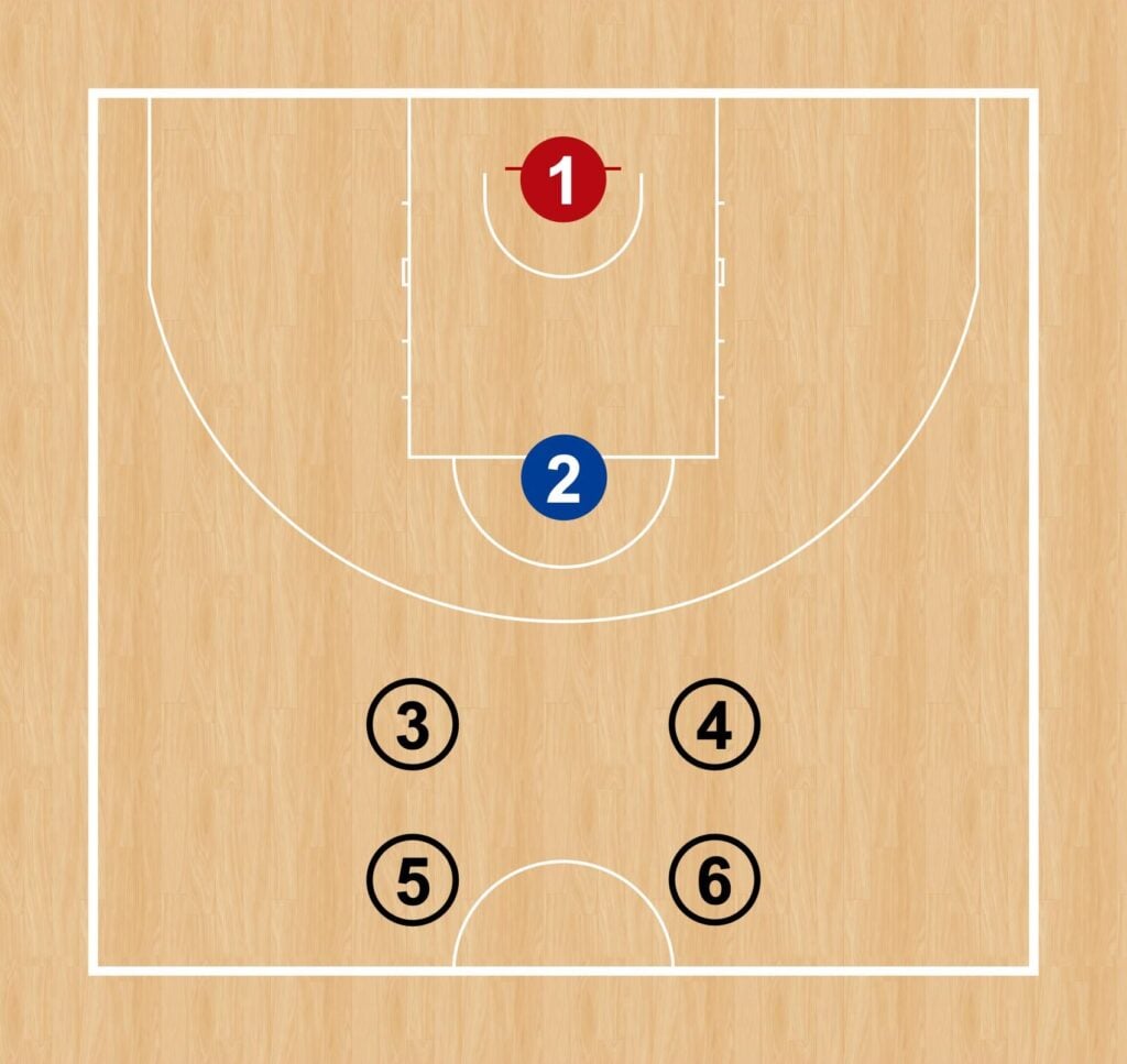 Los jugadores que empiezan situados debajo de la canasta y sobre la línea de tiros libres, respectivamente, avanzan y se encuentran el uno con el otro.