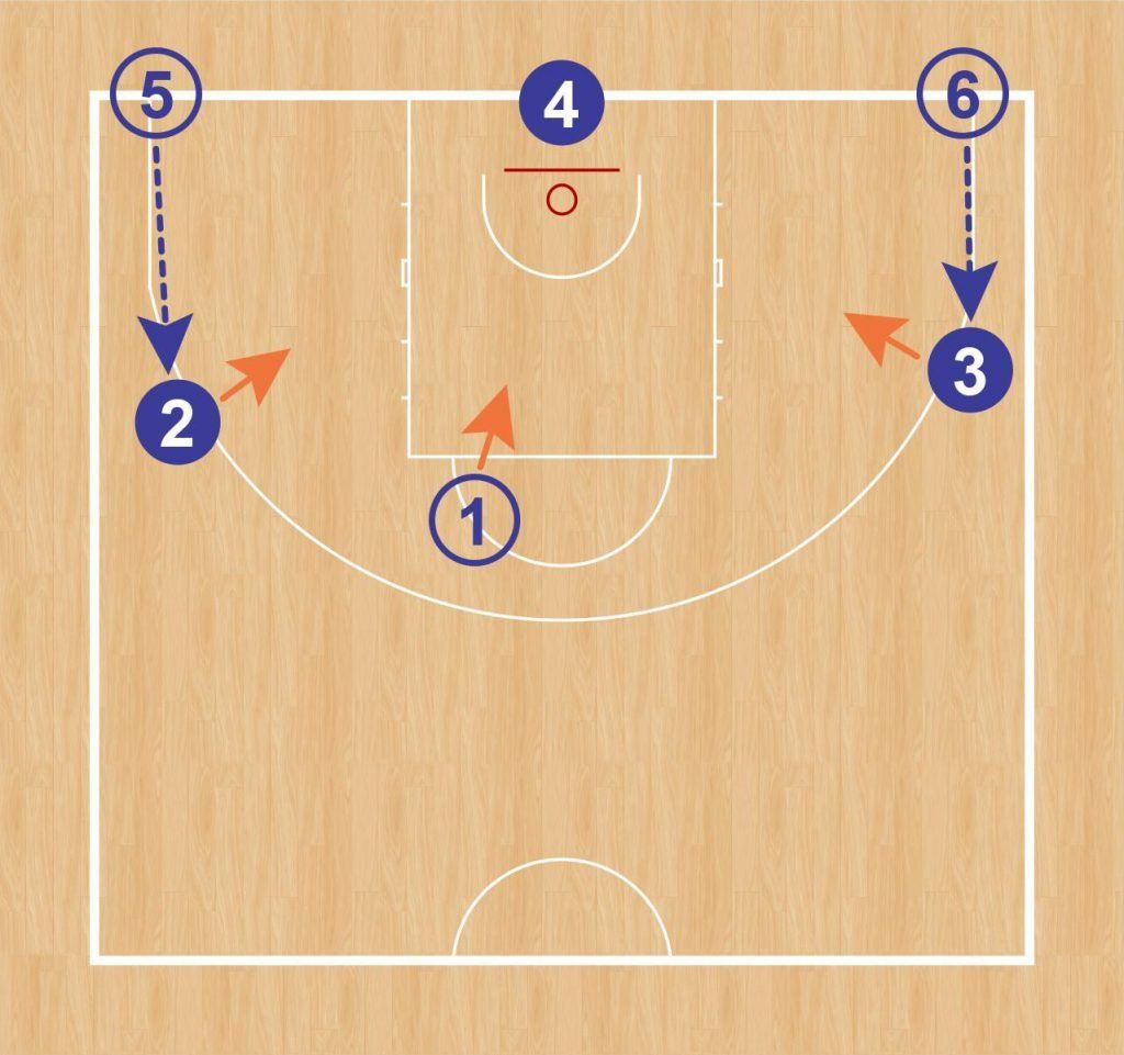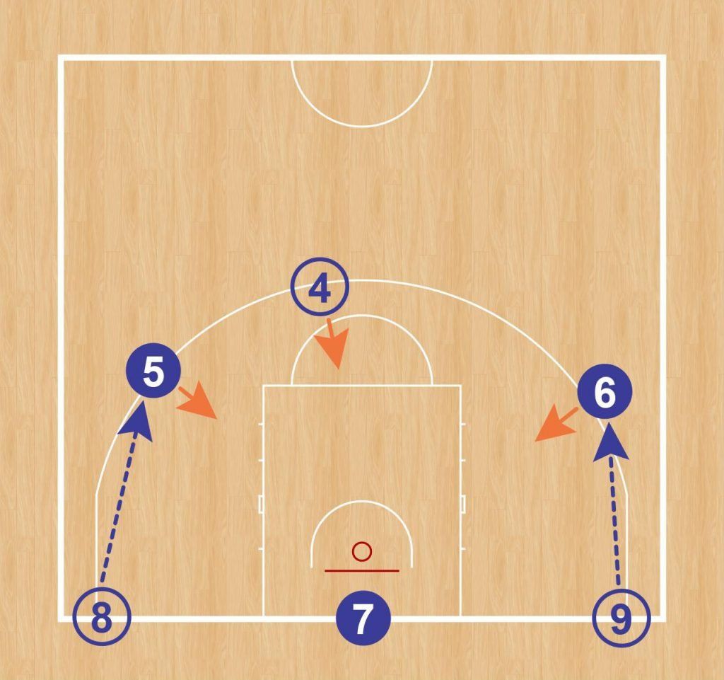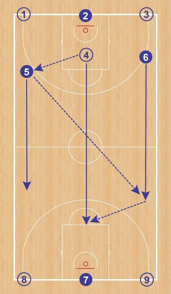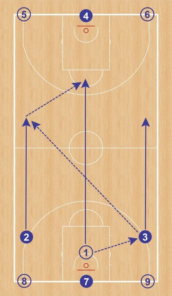 - Tras ejecutar el pase, los jugadores de las esquinas deben puntear y bloquear el rebote de los tiradores.