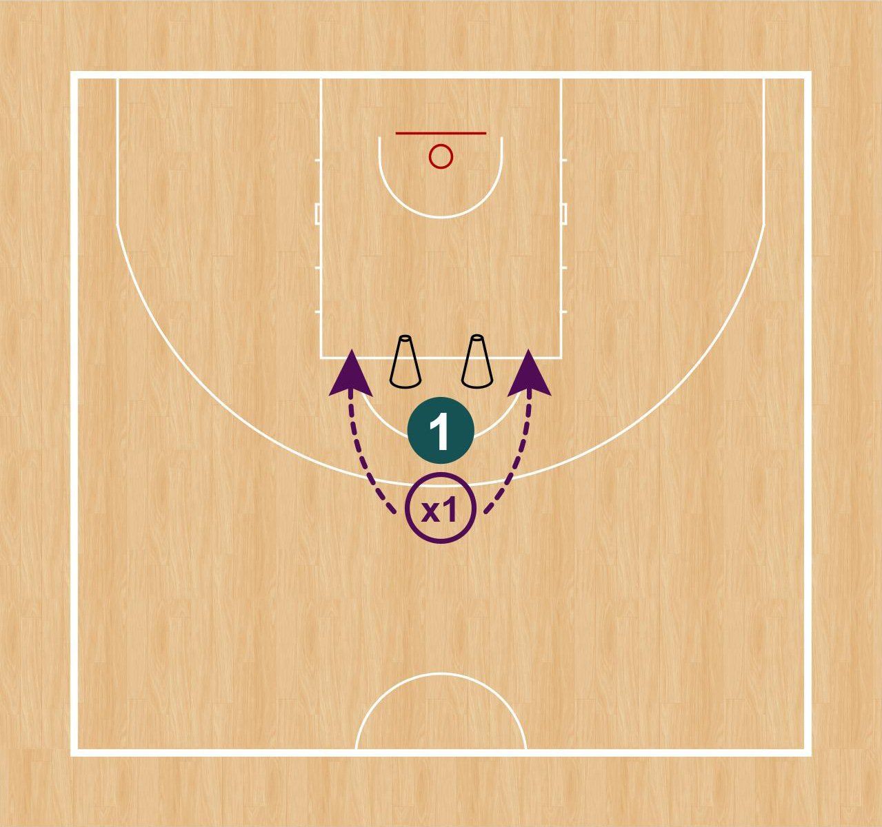 Sobre el agarre y empleando el menor número posible de botes, el atacante penetra y finaliza con la mano lejana respecto al defensor, quien recupera desde el lado contrario (botando su balón).