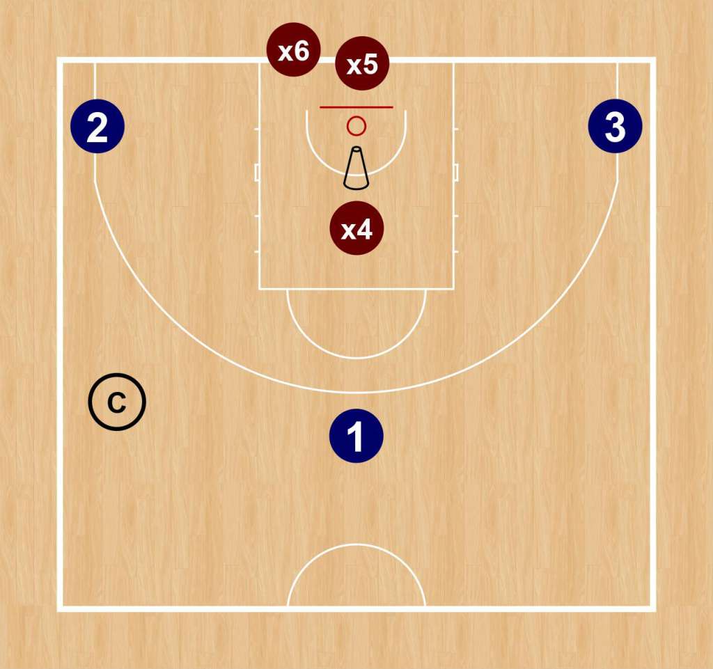 El jugador que recibe ese pase inicial ataca el closeout del primer defensor trabajando OBLIGATORIAMENTE una salida cruzada (hacia la izquierda o hacia la derecha a su libre elección).