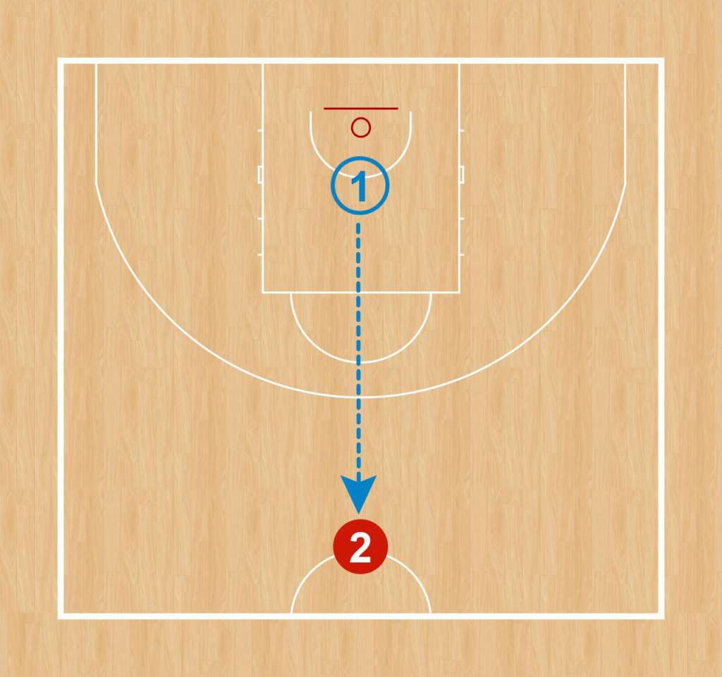 El jugador con balón (situado inicialmente debajo de la canasta) pasa a su compañero (ubicado aproximadamente sobre el círculo de medio campo) y, acto seguido, avanza en su dirección.